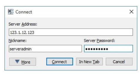 Open TeamSpeak client on your computer. Open the connect dialog (CTRL + S) enter the IP address of your server, the nickname serveradmin the password: